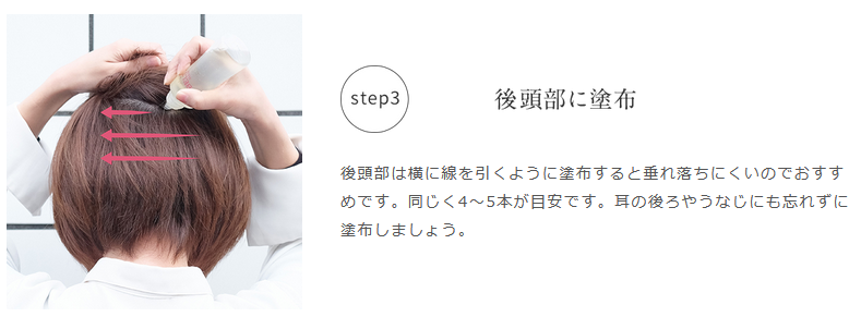 前から頭頂部に、ボトルをプッシュしながら線をえがくようにつけます。
